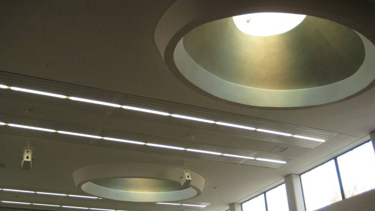 Installation of large Rooflights F100 with SHEV and ventilation function into a sports hall. The SHEV system and ventilation technology is not visible from the ground.
