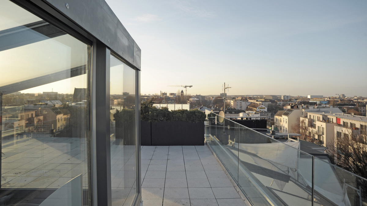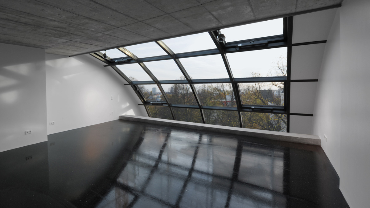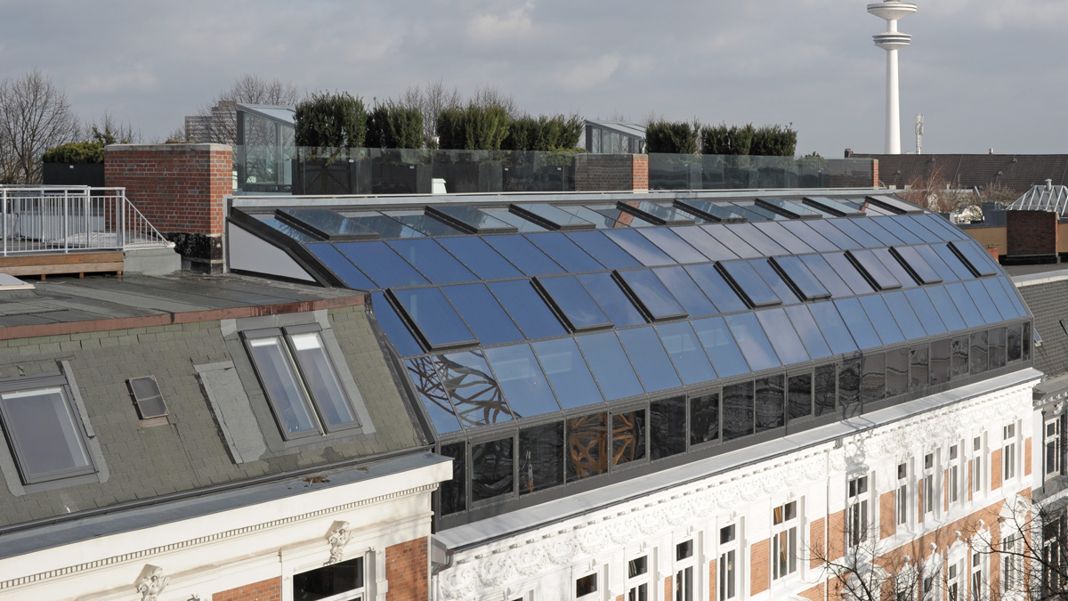 - Solar control insulation glass in slanted roof and vertical section with a Ug value = 0.6 W/(m²K), 24% light transmission and 14% total energy transmission